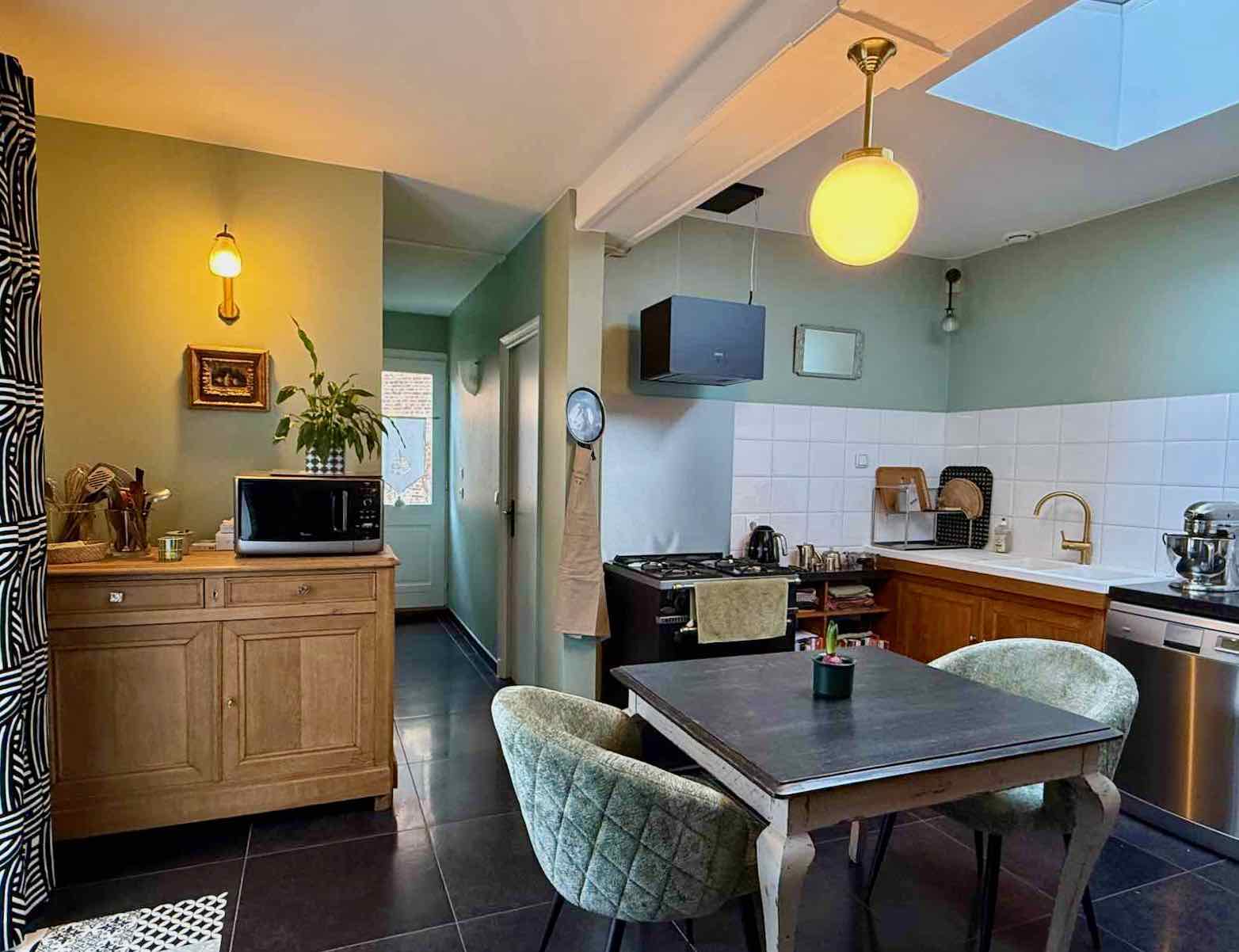 Côté couleur, le choix n’a guère été difficile. Voilà un bon moment que j’avais décidé de remplacer l’ancienne couleur mauve des murs par un vert tendre. Un vert qui serait en harmonie à la fois avec le chêne des meubles et le noir de la pierre de Tournai et du carrelage au sol.