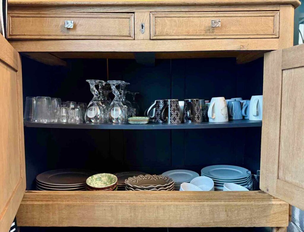 Aurélie a donc décapé le buffet de ma cuisine par aérogommage, avant d’appliquer une couche de protection neutre et de repeindre l’intérieur en noir. Chic et style pour mon vieux meuble, qui a retrouvé une nouvelle jeunesse…