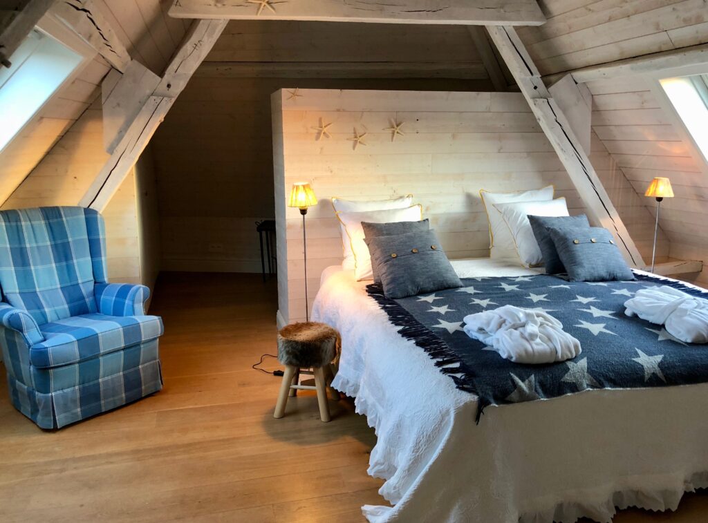 On monte encore et voici la chambre Knokke-le-Zoute, qui occupe tout le dernier étage. Rien que le nom, on respire déjà ! Même si les teintes gris-bleu de la mer du Nord et du bois flotté ainsi que les étoiles de mer de la tête de lit font aussi souffler un petit vent du large. C’est là que j’ai posé mon sac de voyage pour la nuit et que j’ai profité d’un univers cosy et serein après une journée glaciale à arpenter Bruges.