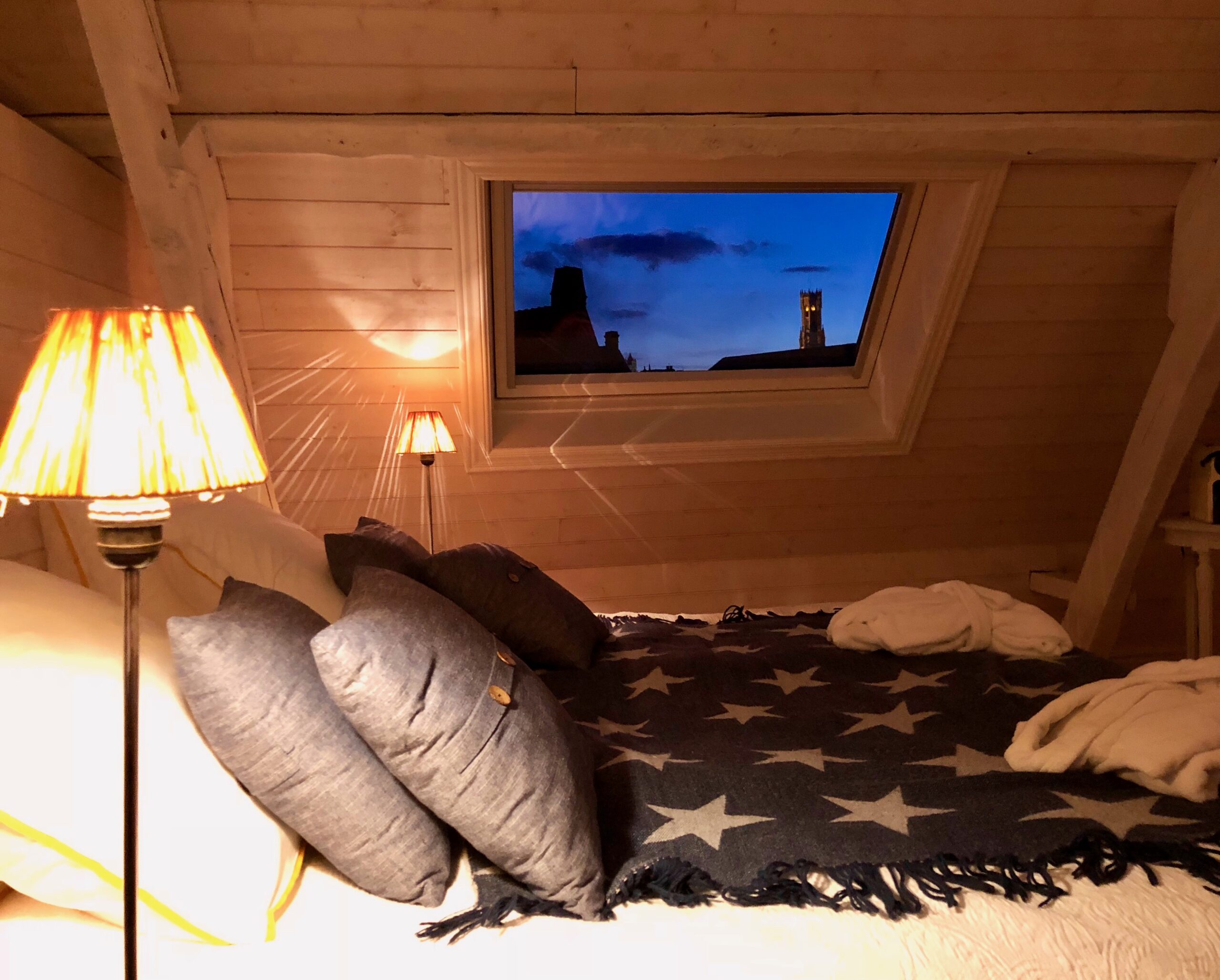 Je me suis lovée sur le grand lit hyper moelleux et j’ai regardé, à travers une fenêtre de toit, le ciel changer de couleur. Côté ville, trois tours -la cathédrale, l’église Notre-Dame et surtout le beffroi- s’y détachaient, un peu à la manière d’ombres chinoises.