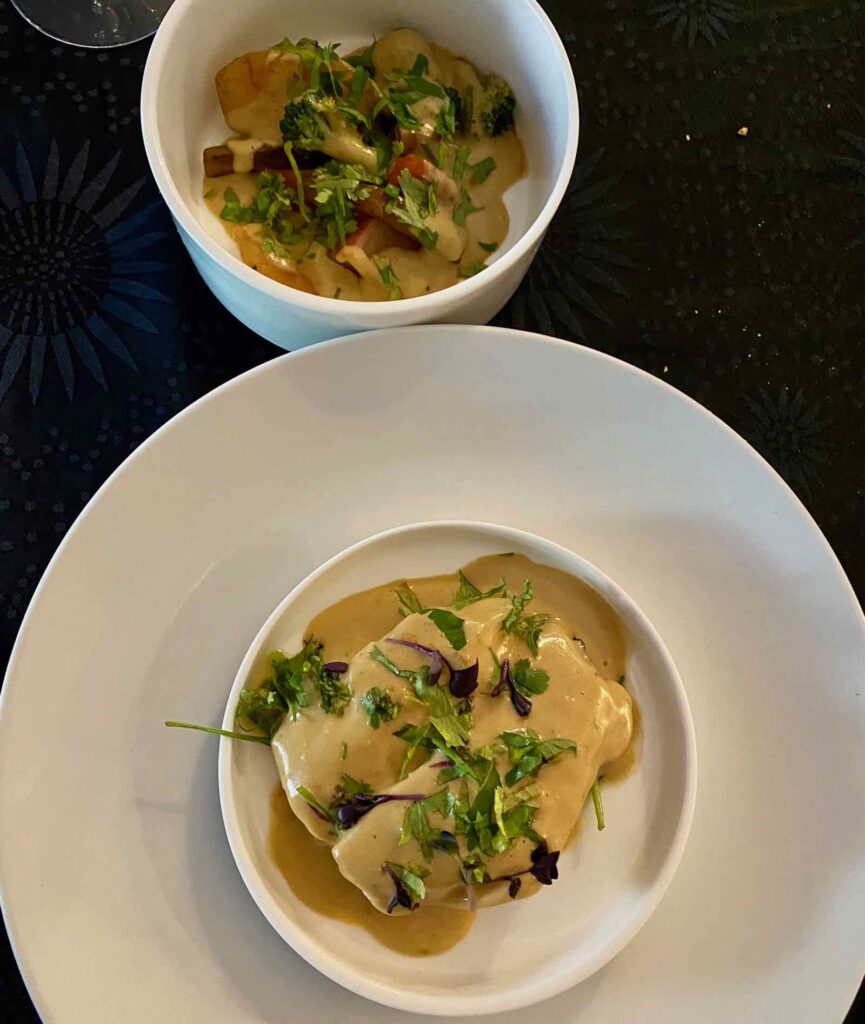 Ceci étant, les Saint-Jacques, purée de panais et pommes curry m’avaient fait bien envie aussi. Bérangère m’a permis de les goûter et je me suis dit que la formule comprenant deux entrées (voir plus bas) était décidément parfaite…