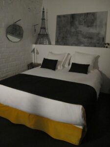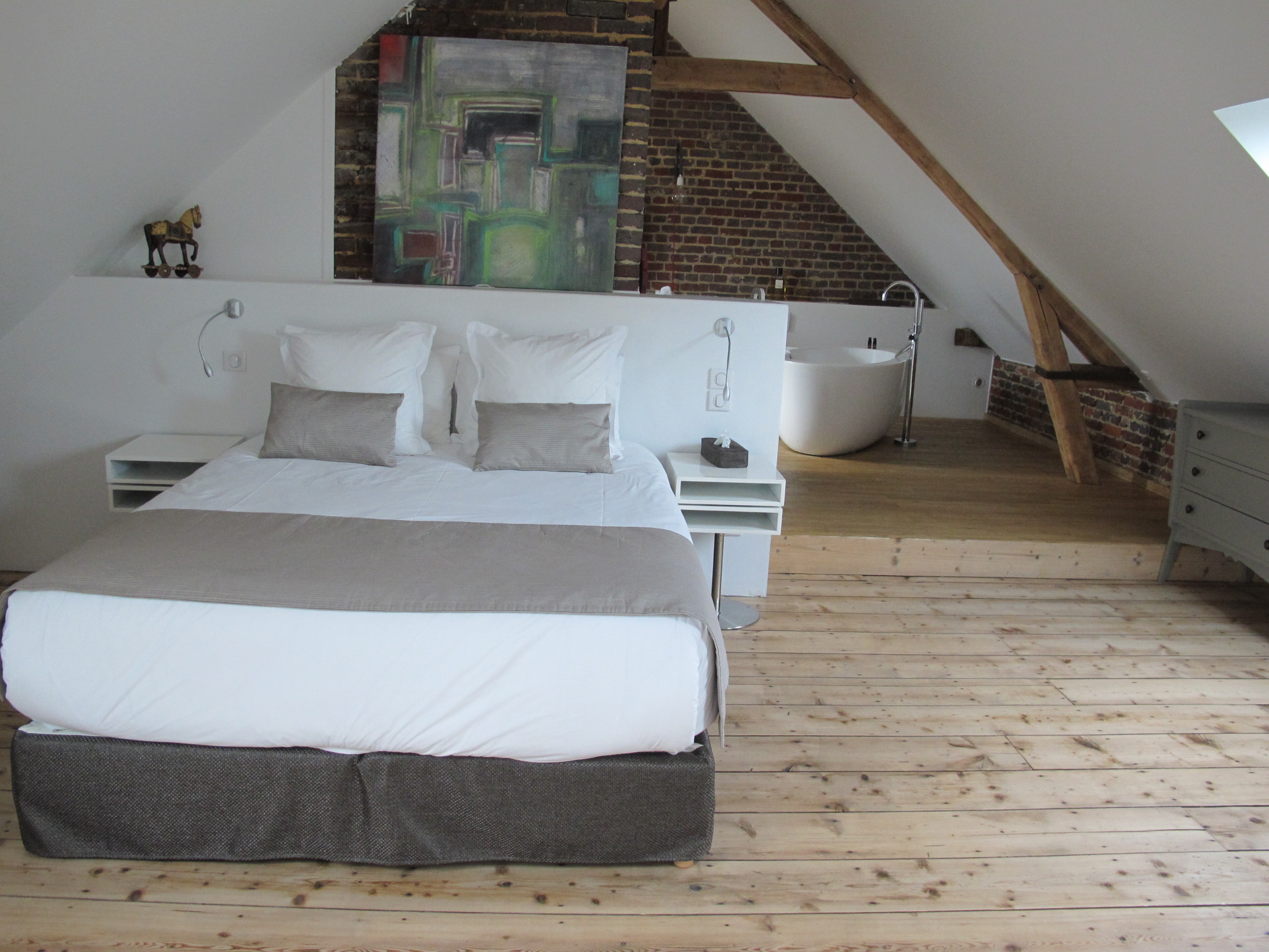 Une nuit dans la chambre Vison et un petit coup d’oeil dans les autres m’ont confirmé que chacune a sa propre ambiance, son propre univers. La Vison, comme la Cerise d’ailleurs, a été pensée dans un esprit loft et décloisonné. J’ai beaucoup aimé l’ancien établi transformé en lavabo mais aussi la baignoire qui trône au milieu de la grande salle de bains.