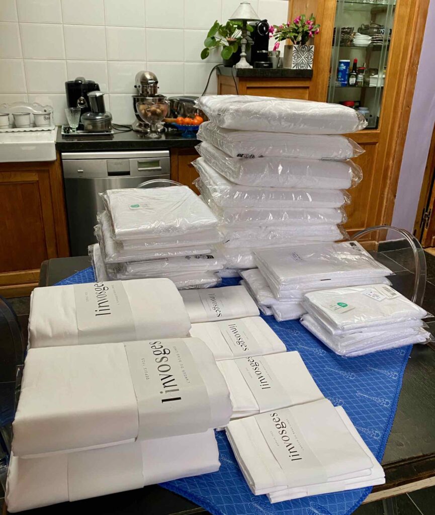 Côté futur aménagement, les choses avancent aussi tout lentement. Je dévalise par deux fois Linvosges, entreprise vosgienne que j’aime bien. Blanc, tout sera blanc, des housses de couette aux taies d’oreiller, en passant par les draps de bain, les serviettes de bain, les serviettes invités…