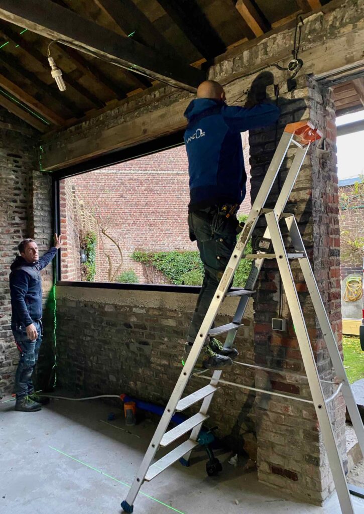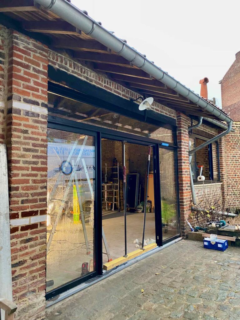 Dès le lendemain, c’est la baie vitrée (ou plutôt la porte d’entrée avec panneaux fixes latéraux et imposte) qui trouve sa place, sur le joli seuil en pierre bleue.