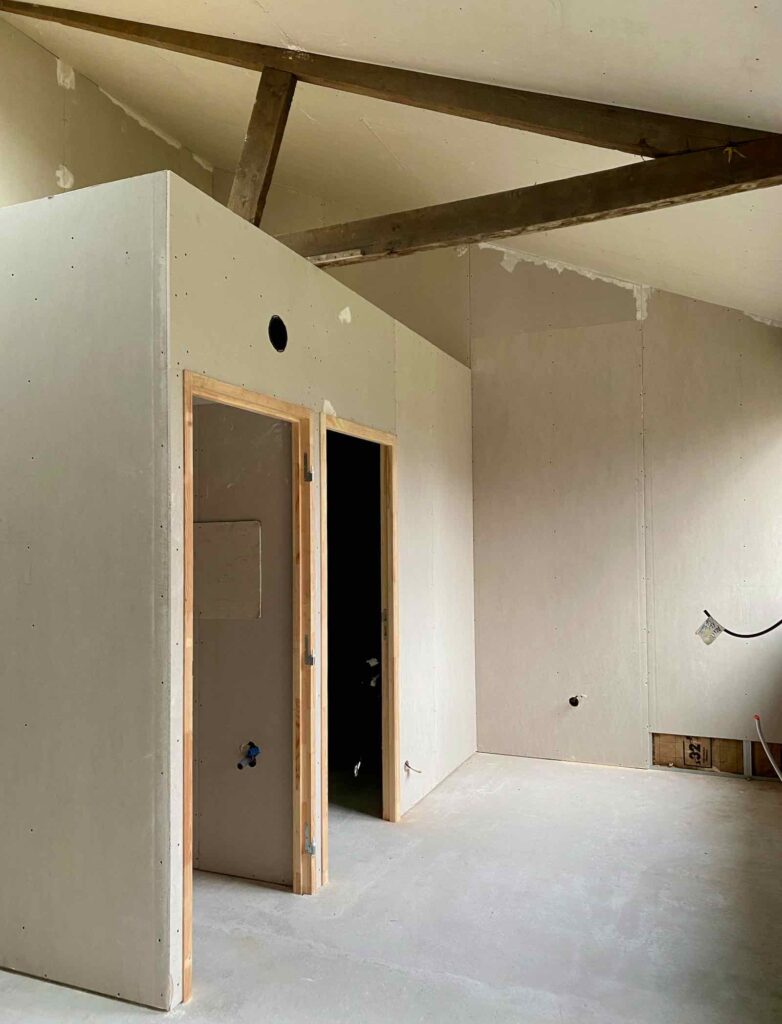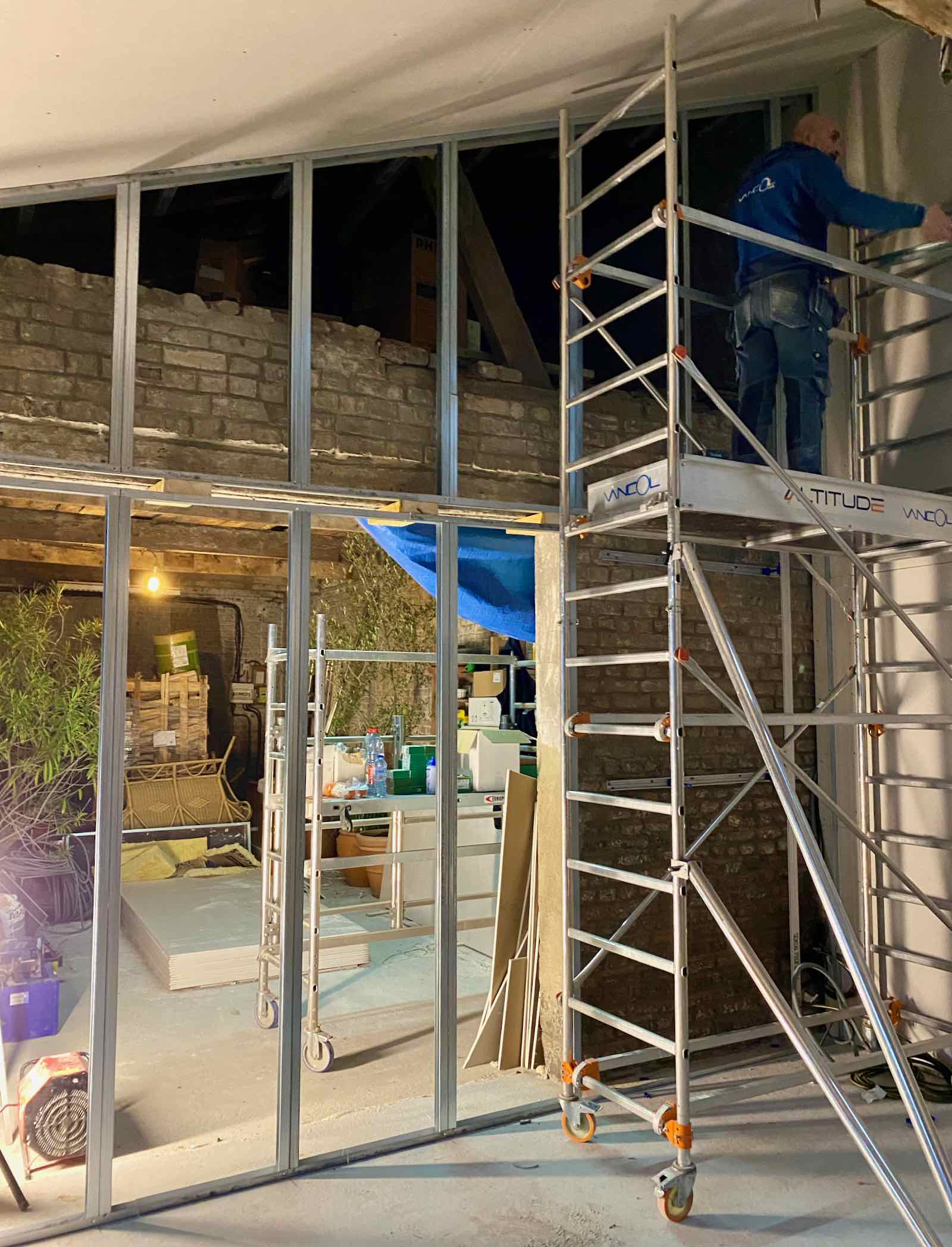 Et, au soir venu, je me rends compte (car non, je ne passe quand même pas toute ma journée sur le chantier) que l’équipe a commencé à esquisser la séparation entre les deux parties du bâtiment. Celle qui restera un atelier et celle qui deviendra le futur hébergement touristique. Une page se tourne…