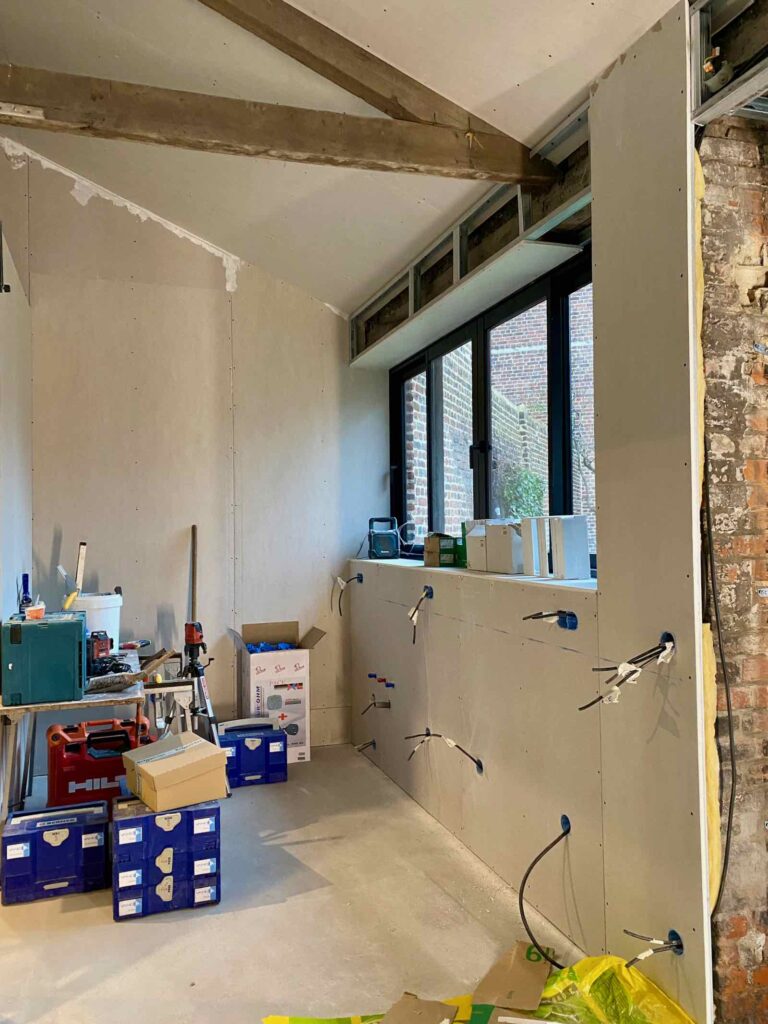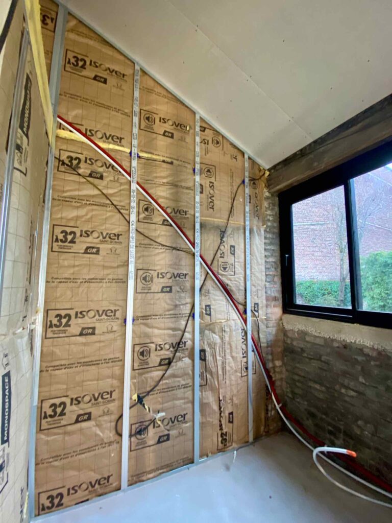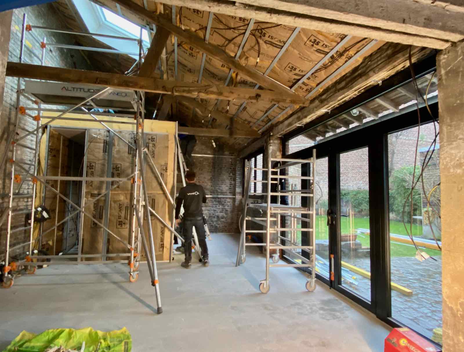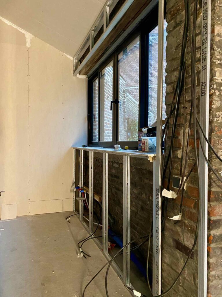 Tandis que le mur sous la fenêtre est presque habillé pour l’hiver. Et paré de toutes les arrivées électriques pour la future cuisine (pas encore choisie), qui prendra place sous cette fenêtre. Vous vous voyez entrain de préparer le café du matin, avec vue sur le jardin ? Moi, carrément !