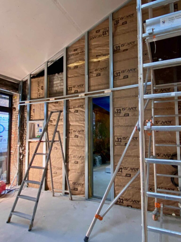 De jour en jour et même d’heure en heure, les murs se couvrent d’un manteau d’isolation en laine de verre puis de Placo BA 13 (j’ai regardé sur le devis…). Et, à l’heure du week-end, c’est toute une partie du local qui est (presque) terminé…
