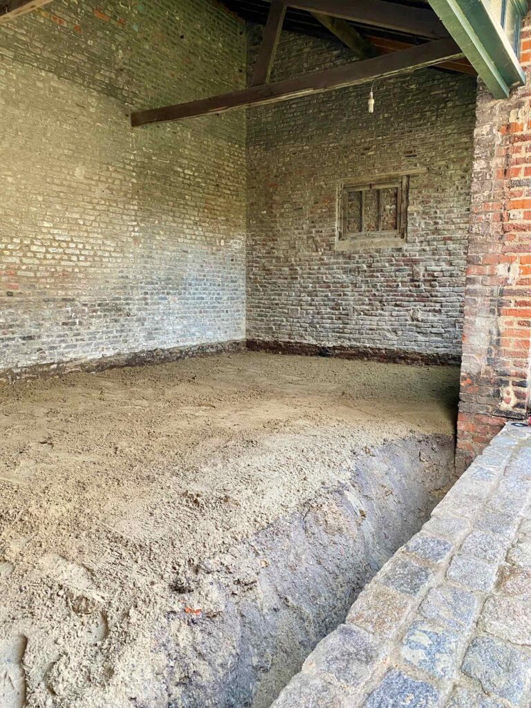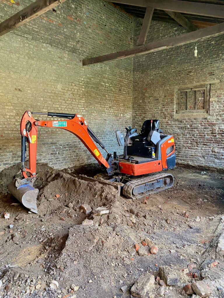 Premier jour du chantier. J’attends comme le Messie le petit bulldozer, qui va ouvrir les hostilités et décaisser le sol d’une vingtaine de centimètres. Il arrive, tout rutilant, et grignote avec appétit le sol de mon atelier.