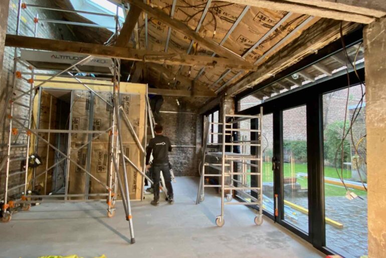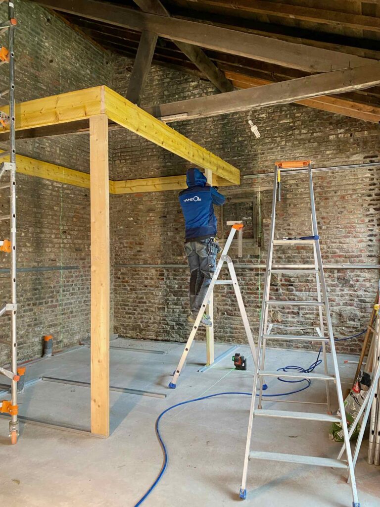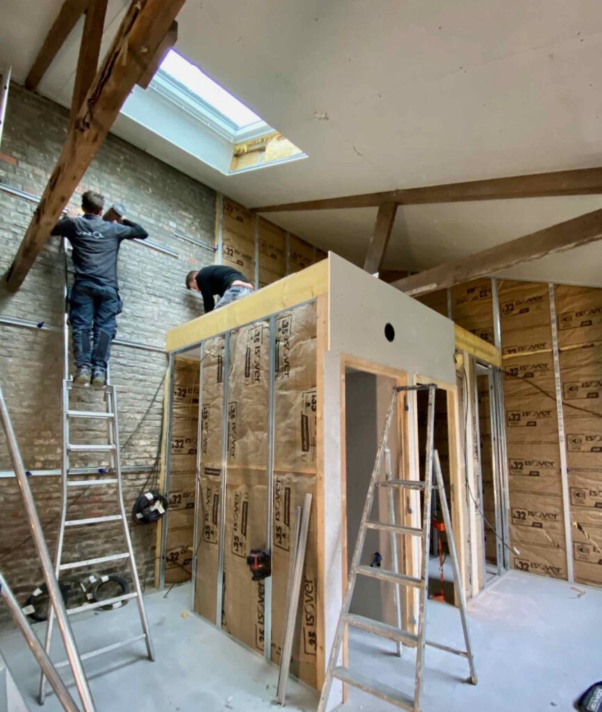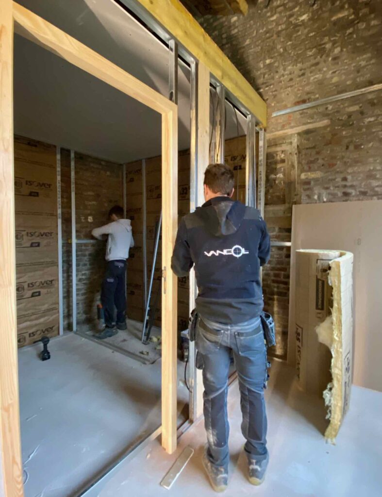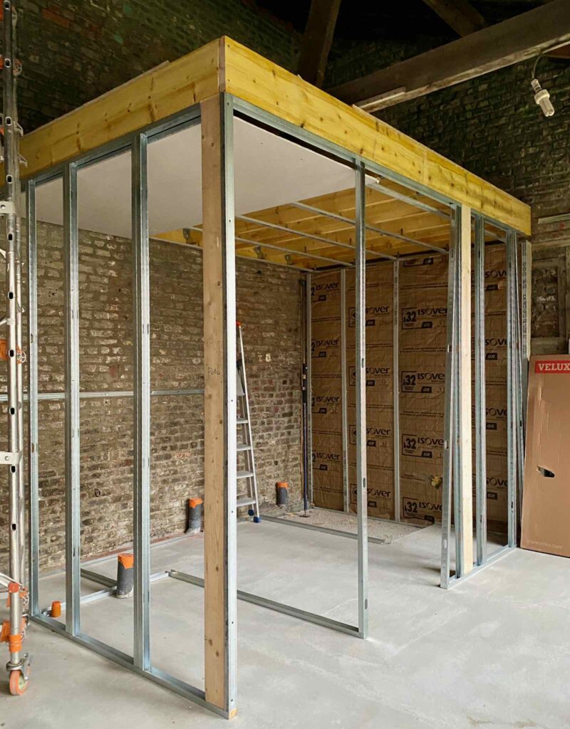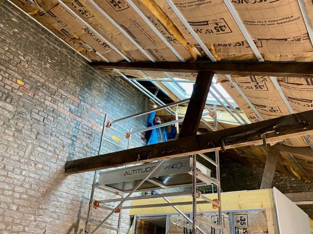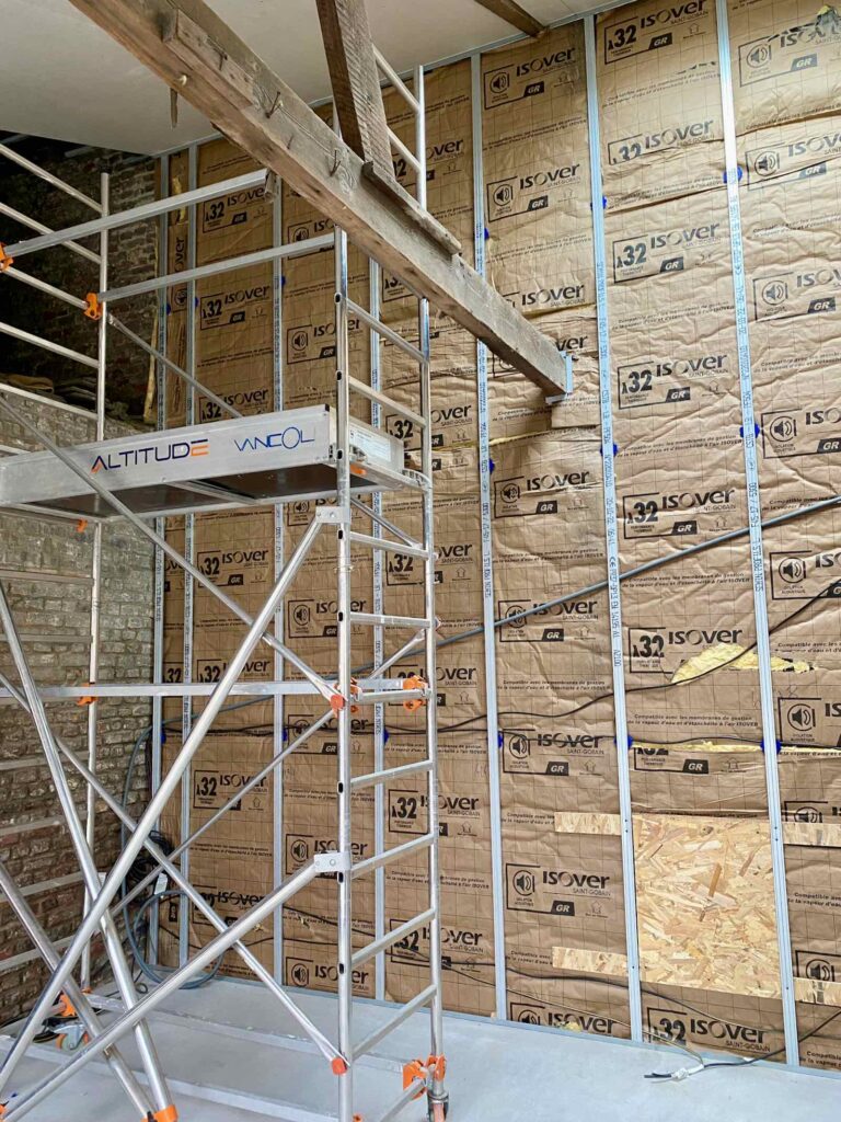 Le bâtiment étant désormais « hors d’eau hors d’air », comme on dit dans la profession, l’entreprise Vancol peut s’attaquer aux premiers travaux intérieurs. À commencer par monter la structure du bloc sanitaire, qui comprendra une salle de bain avec douche à l’italienne et des WC séparés, plus un petit placard/penderie.