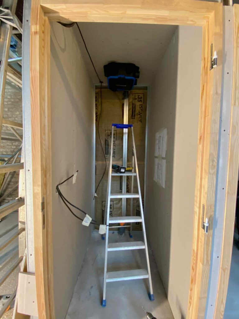 Le lendemain, retour à l’intérieur et au sec. Installation de la VMC dans le plafond des toilettes. Et préparation des cloisons et de l’isolation du bloc sanitaires.