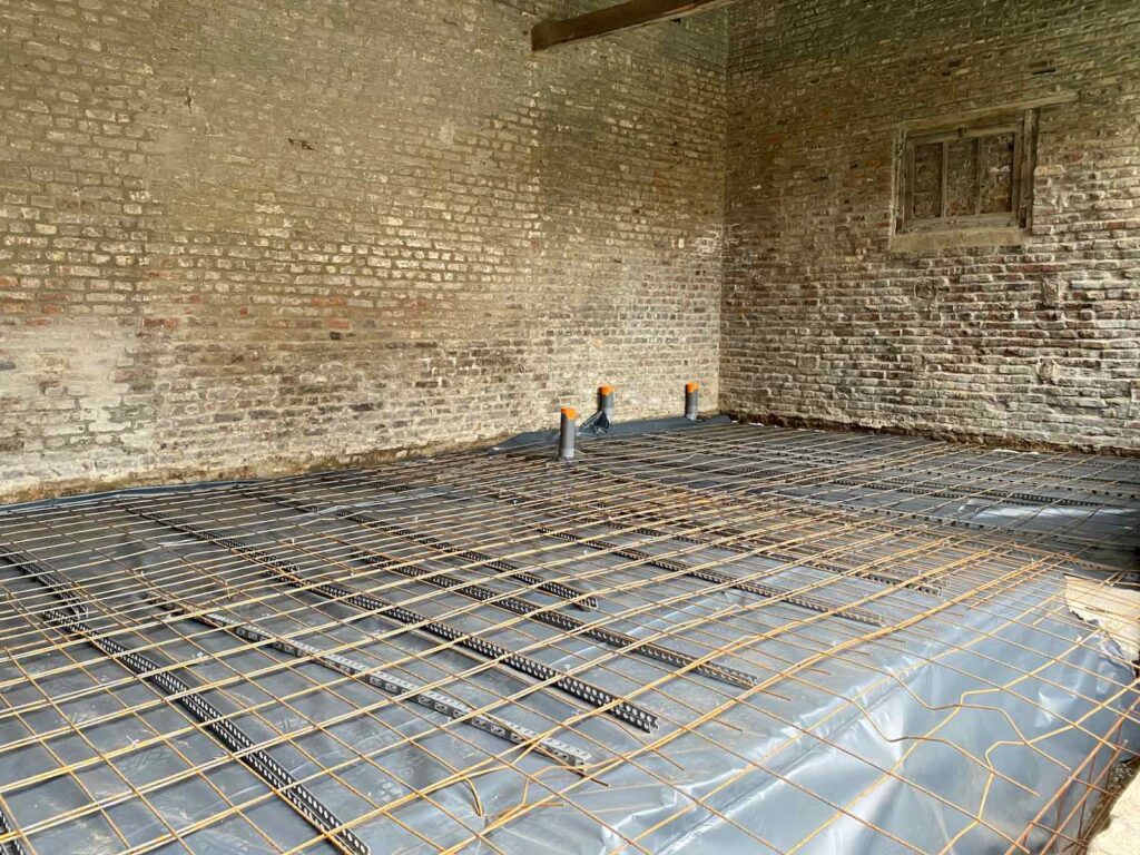 Avant de recouvrir le tout d’une membrane de plastique, pour une bonne étanchéité, et de fers à béton.