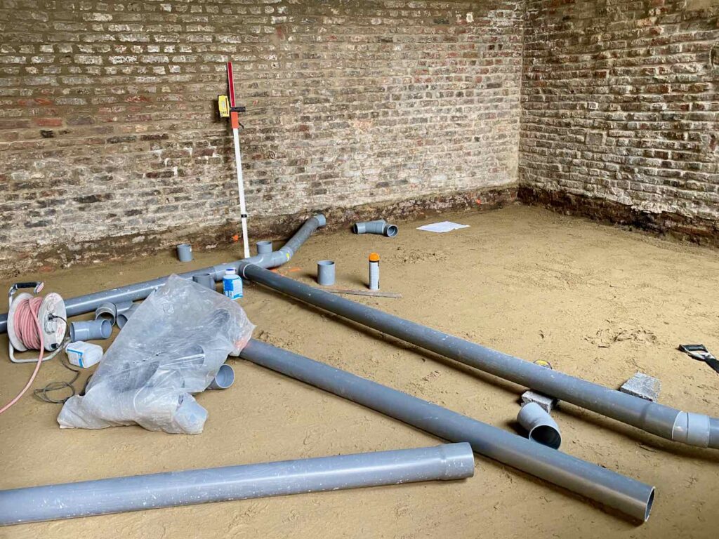 Ce sable une fois damé, les choses sérieuses peuvent commencer. Les maçons positionnent l’ensemble des tuyaux d’écoulement, qui disparaitront sous la dalle béton.