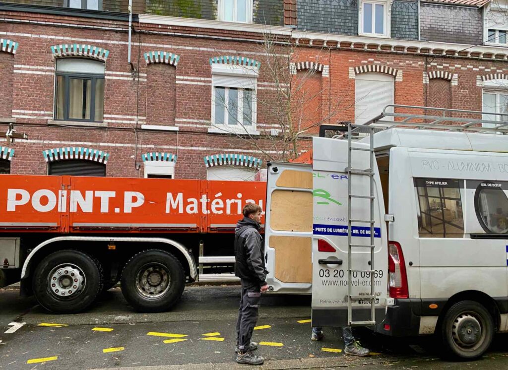 Je suis plus excitée qu’un soir de Noël, quand j’étais enfant. C’est aujourd’hui qu’on livre baie vitrée, grande fenêtre coulissante et fenêtre de toit pour mon futur hébergement touristique, et ce moment-là, je l’attends depuis des mois ! Dès la première heure, deux livraisons arrivent de concert, dont celle de la baie vitrée.