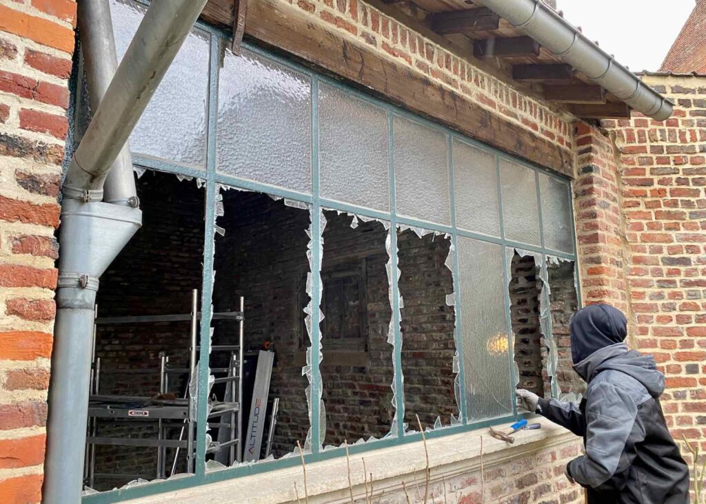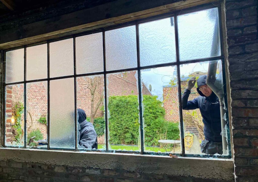 Mais aussi casser la fenêtre d’atelier, dont le châssis était en place depuis les années 30. Dommage c’est vrai mais impossible de faire autrement, tant il était imbriqué dans la maçonnerie…