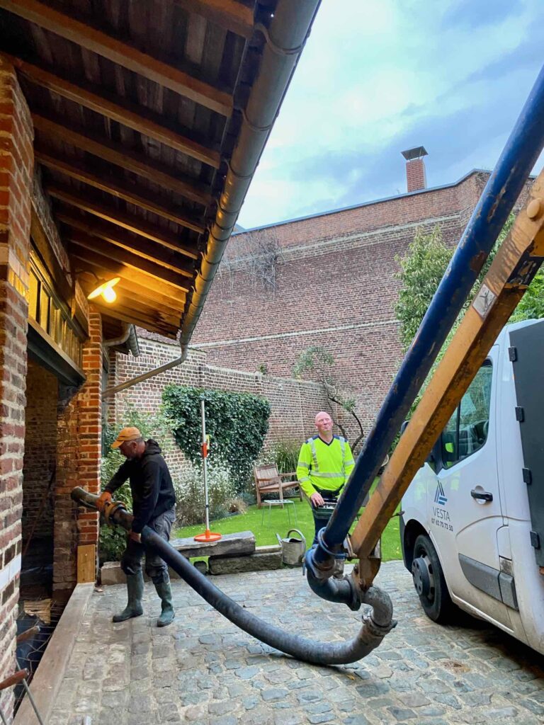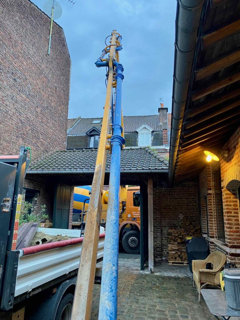 Dès potron-minet, la toupie stationne devant la maison. Et, faute de pouvoir passer le porche d’entrée, déploie son immense bras articulé au-dessus de ce dernier.