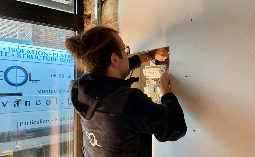 Quatre gars et huit bras font avancer le chantier à toute berzingue. Hugo installe le tableau électrique caché dans la cloison.