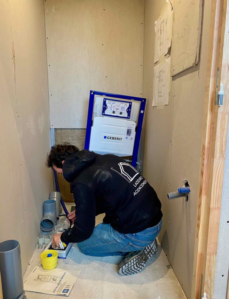 Vincent, de la société Ladeiro Agencement, installe la chasse d’eau, qui disparaitra ensuite dans un coffrage (enfin j’espère…).