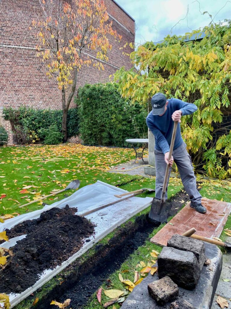 D’après ce que j’avais compris, l’eau devait arriver directement de la rue, où se trouve à la fois le réseau et mon compteur. C’était simple, direct et sans problème. Enfin, c’est ce que je croyais. Car, finalement, Thomas, mon maître d’œuvre, m’a annoncé qu’en fait il faudrait prendre l’eau dans ma maison. Aïe, aïe, aïe, les choses se compliquaient. En attendant la venue du plombier (et un trou dans le plafond de ma cuisine), une tranchée a été creusée dans le jardin, entre la maison et le futur hébergement. But de l’opération ? Passer une grosse gaine, qui accueillera le tuyau d’eau, en direct de ma lingerie.