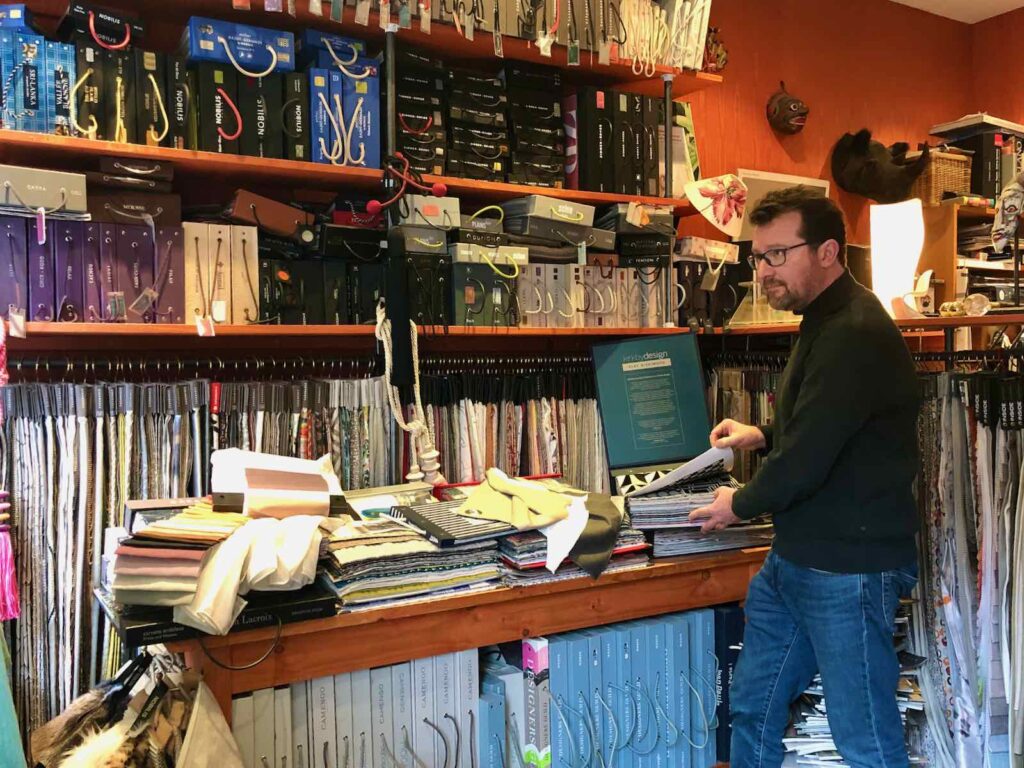 Je n’ai malheureusement qu’une photo un peu ancienne d’Olivier Pleterinck de Comme chez Soie, que j’ai contacté fin janvier pour parler rideaux, double rideaux et stores. Olivier est un tapissier d’exception, ancien Compagnon du devoir. Il a roulé sa bosse dans divers pays et villes (dont l’élégante Florence), avant de se poser dans la métropole lilloise, à La Madeleine. Comme d’habitude, il a immédiatement compris ma demande et m’a proposé de chouettes solutions. À découvrir dans le prochain épisode…