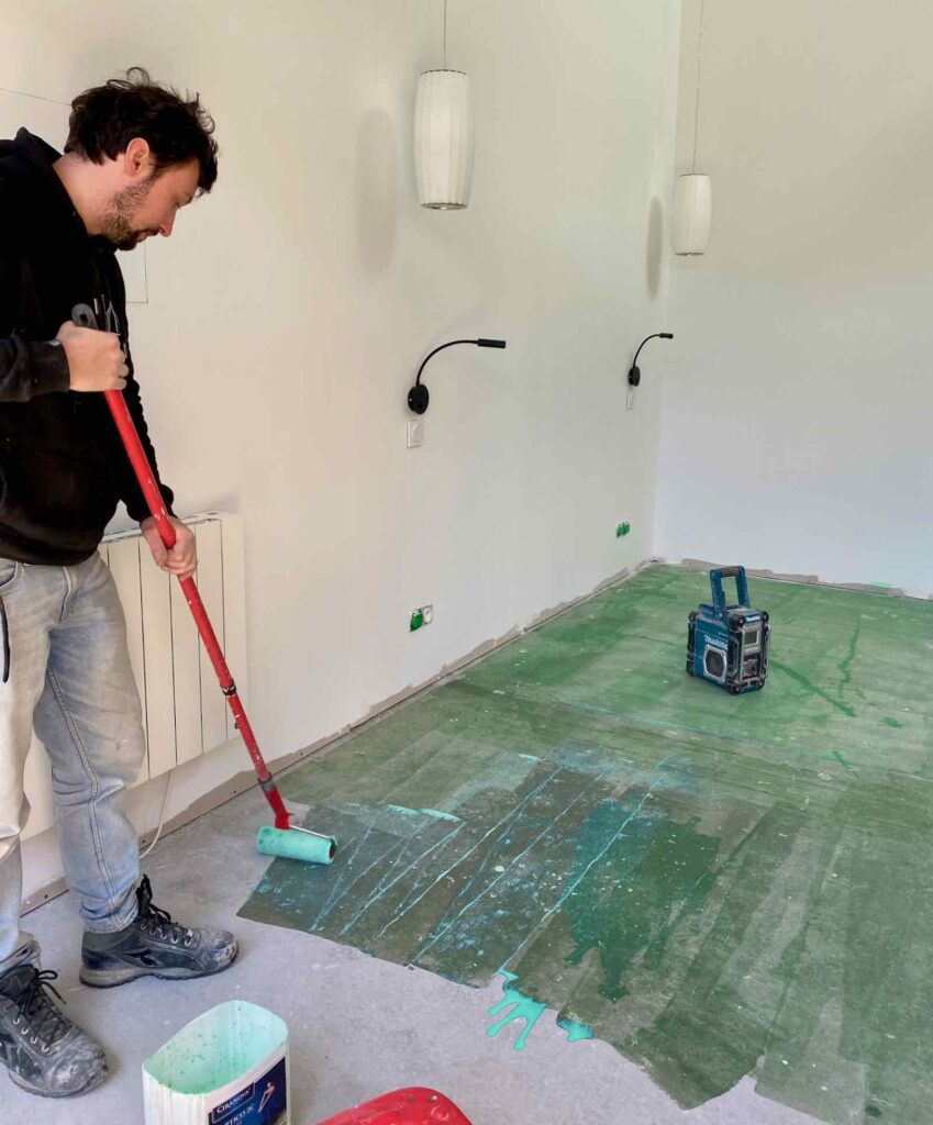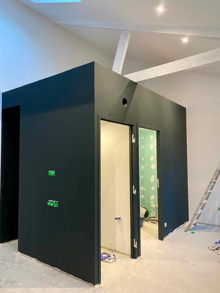 Mais ce qui change vraiment tout, c’est la couche de Black Tie de Flamant, un noir tirant joliment sur le vert, posée sur le futur bloc sanitaire.