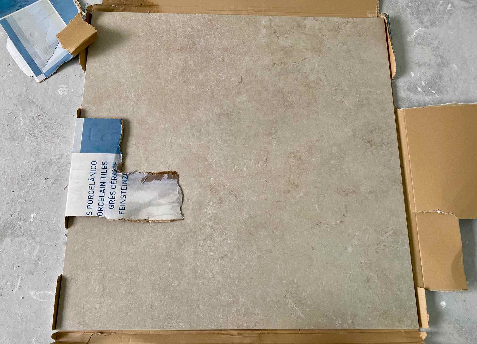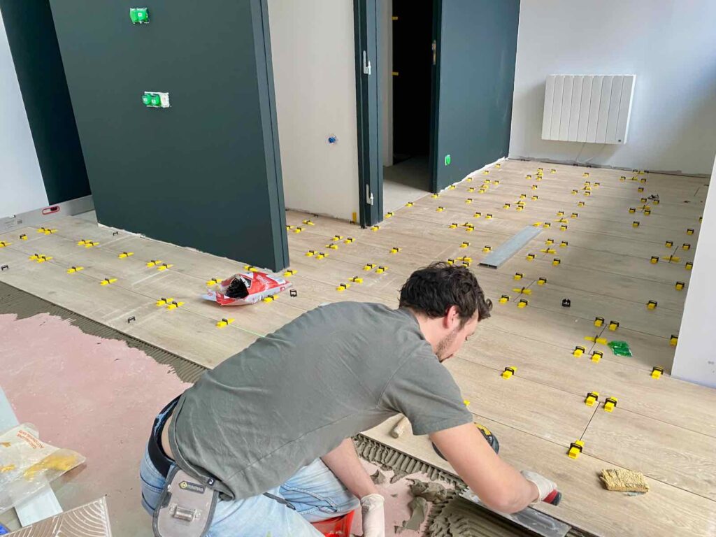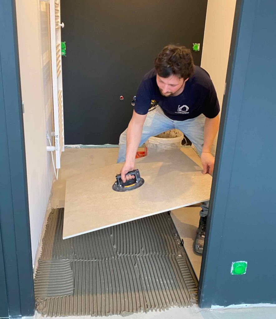 Après le ragréage, c’est ensuite au tour du carrelage d’être posé, à la fois sur les murs de la douche et au sol de la salle de bain. J’ai choisi des carrelages en grès cérame 90 X 90 cm de La Carotech à Ronchin… pas franchement faciles à manipuler.