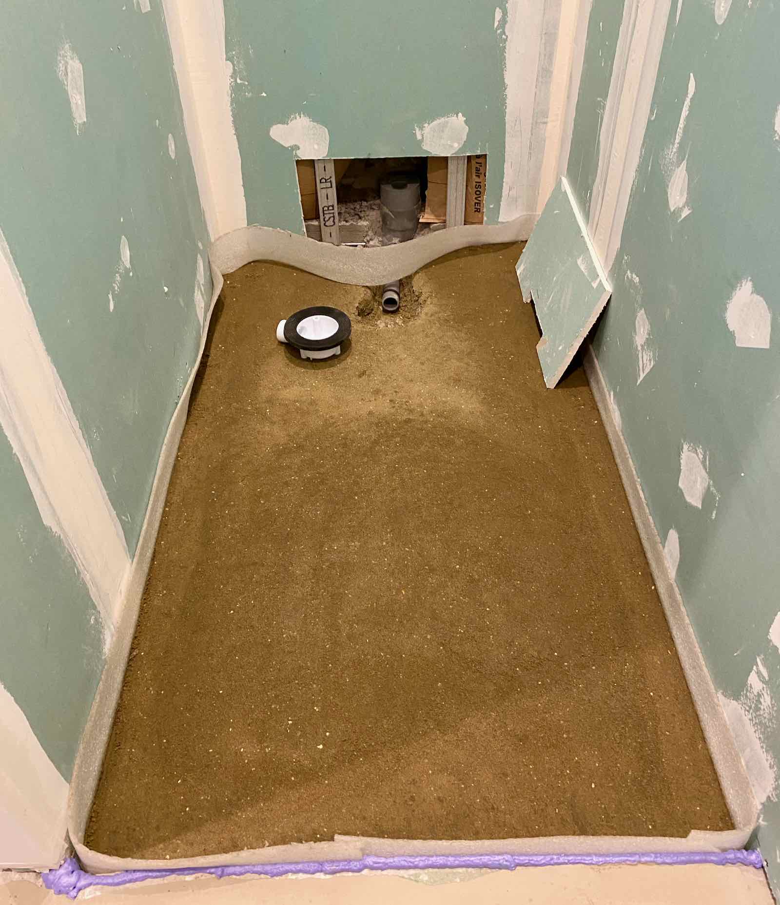 Une chape, mélange de sable et de ciment ayant été coulée, le receveur peut à son tour être installé, prêt pour la première douche.