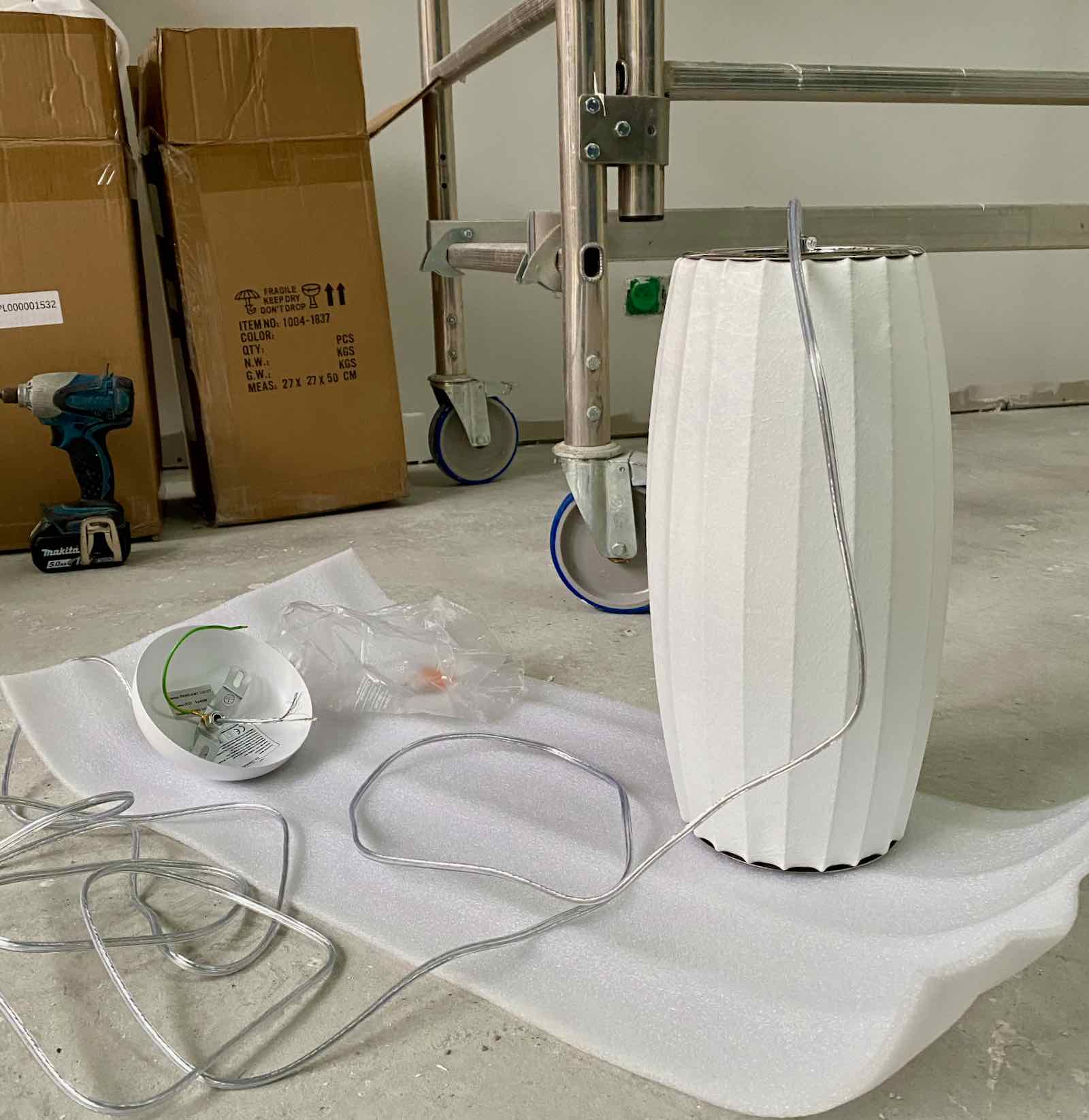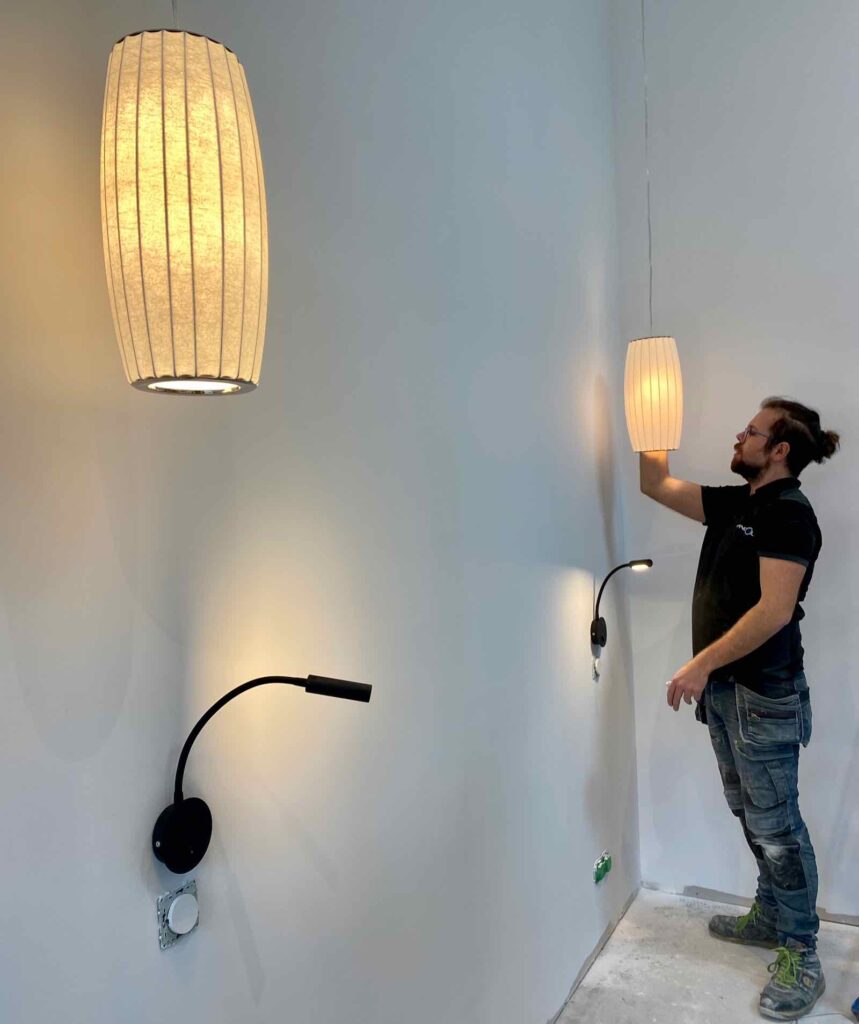 Et comme ils sont super sympas, ils installent également les liseuses (achetées en ligne il y a une éternité, le jour du Black Friday) mais surtout les deux suspensions. Il est vrai que fixée à près de 5 mètres pour la plus haute, je ne vois pas, à part Hugo, qui aurait pu escalader pour les fixer au plafond en pente.