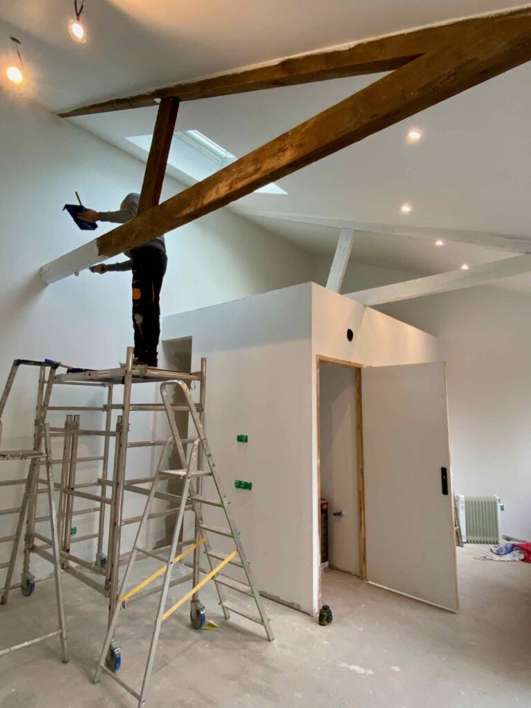 Après les murs, ce sont les poutres qui s’habillent de blanc, ce qui apporte un sacré coup de frais et de neuf !