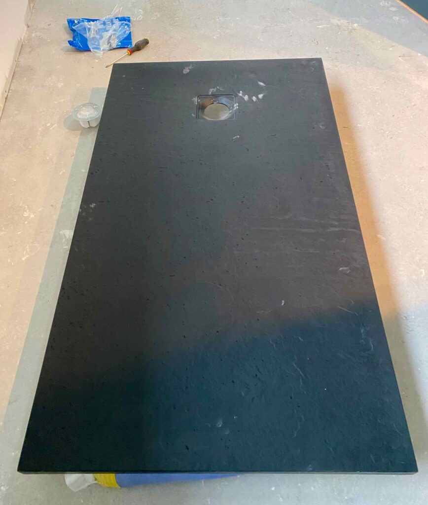 Un mois après le départ des peintres, voici enfin l’arrivée de Vincent, carreleur et installateur sanitaire. Sa première tâche ? Installer le receveur de douche, une élégante bête noire, avec une texture ardoise (Nuovvo modèle Slate, 140 cm X 80 cm), assortie à la future robinetterie de mon hébergement touristique.