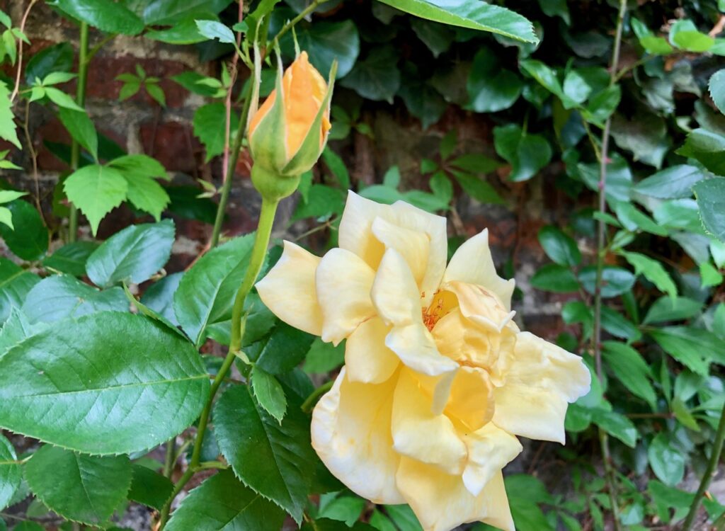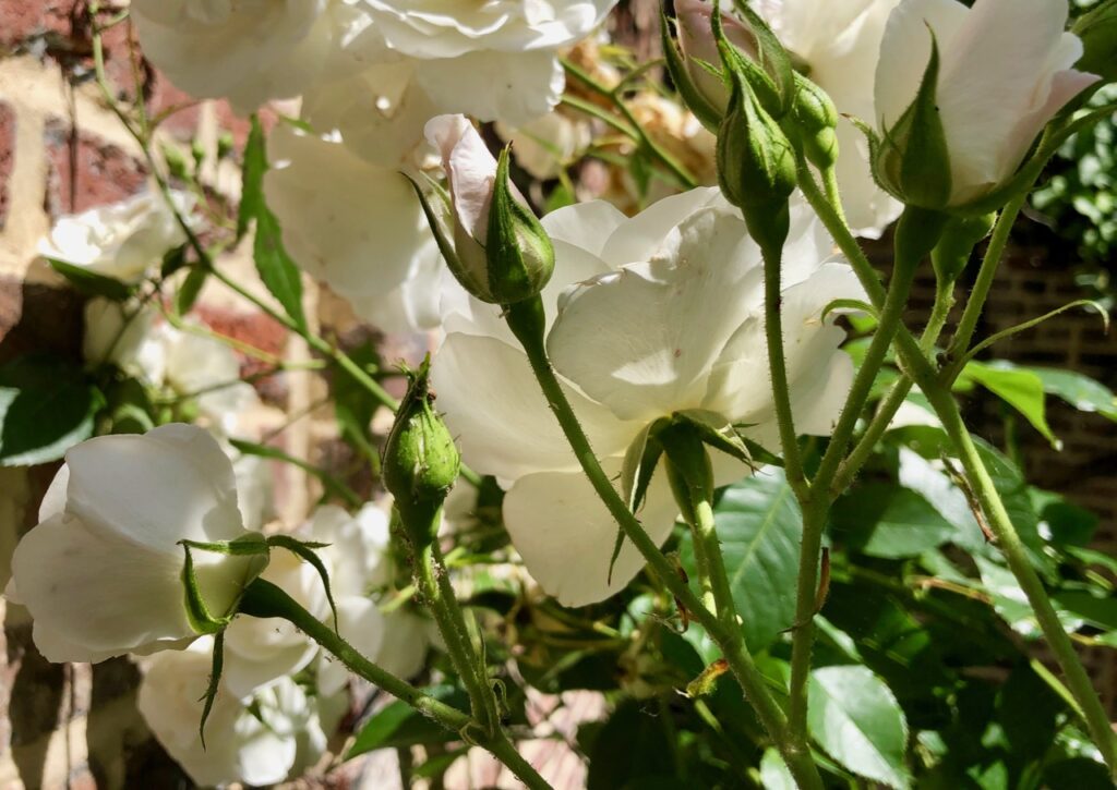 Deux rosiers blancs, qui sont devenus de vrais massifs, et de l’autre côté un rosier jaune, cadeau de mon papa. C’est d’ailleurs mon préféré.