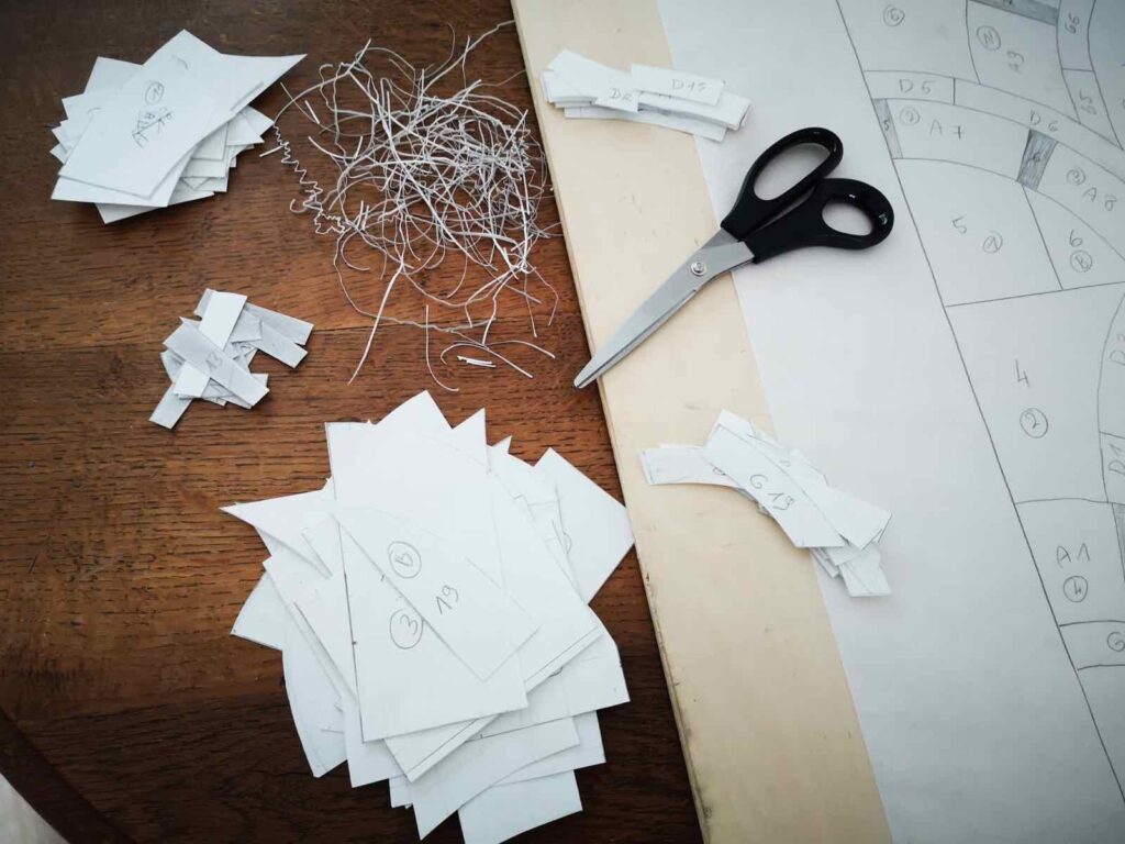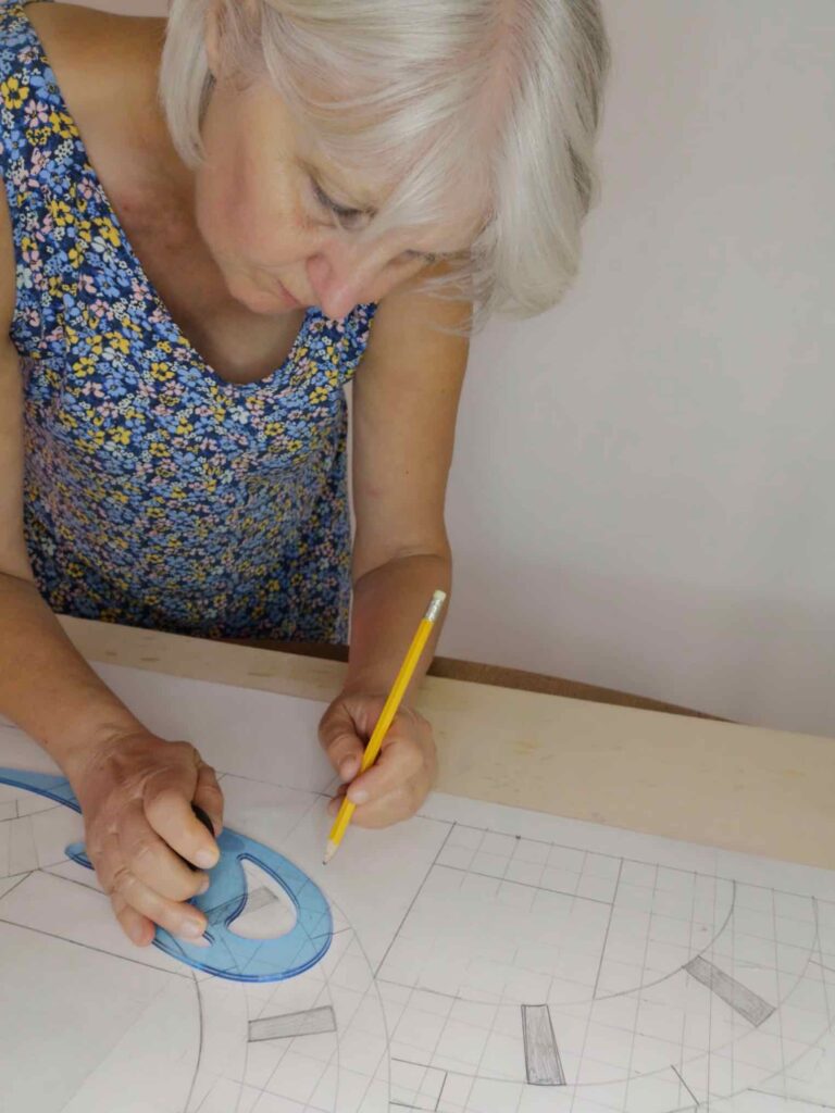 Ceci fait, Françoise s’est adonnée à une séance de découpage, transformant le dessin initial en une série de gabarits papier, un par pièce à réaliser.