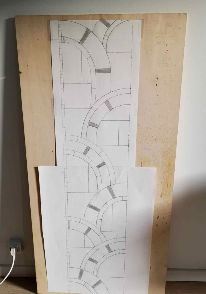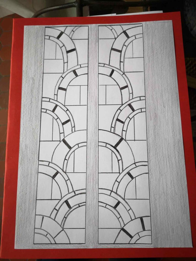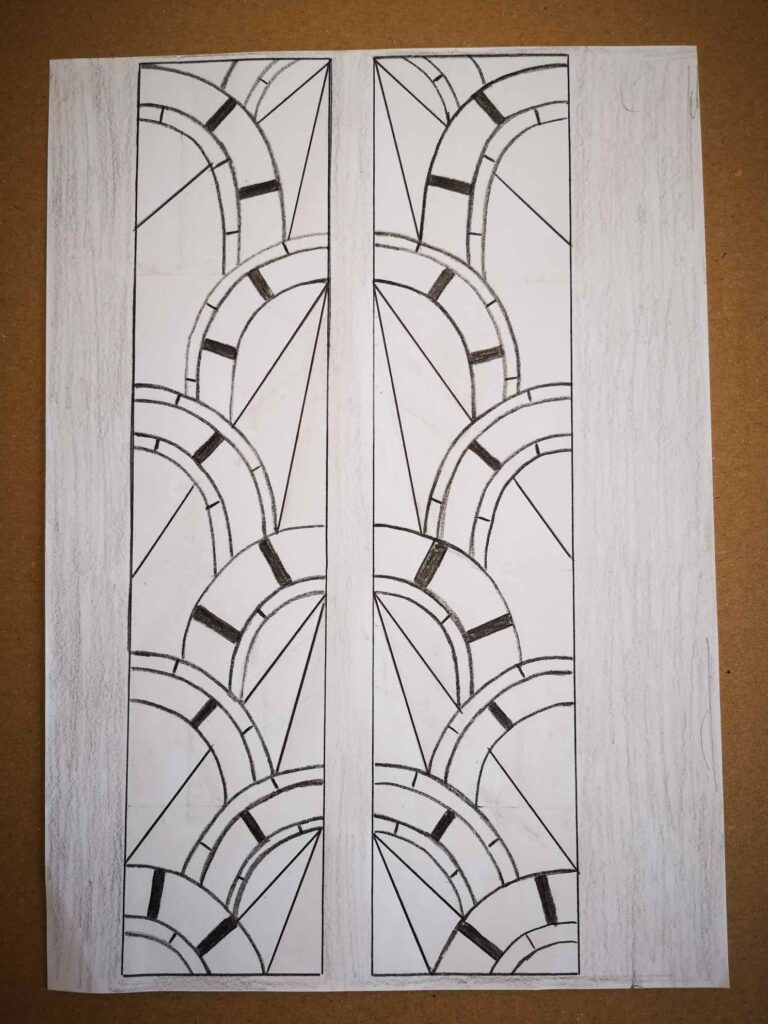 Petit jeu du jour ? Classer les verres par ordre de préférence et noter sur le dessin quel verre ira dans quelle partie du vitrail Art déco. Les arcs intérieurs en gris. Les arcs extérieurs en verre dépoli blanc. Les petites plaquettes en noir. Les plus grandes surfaces avec mes verres préférés, dont celui récupéré sur ma porte.