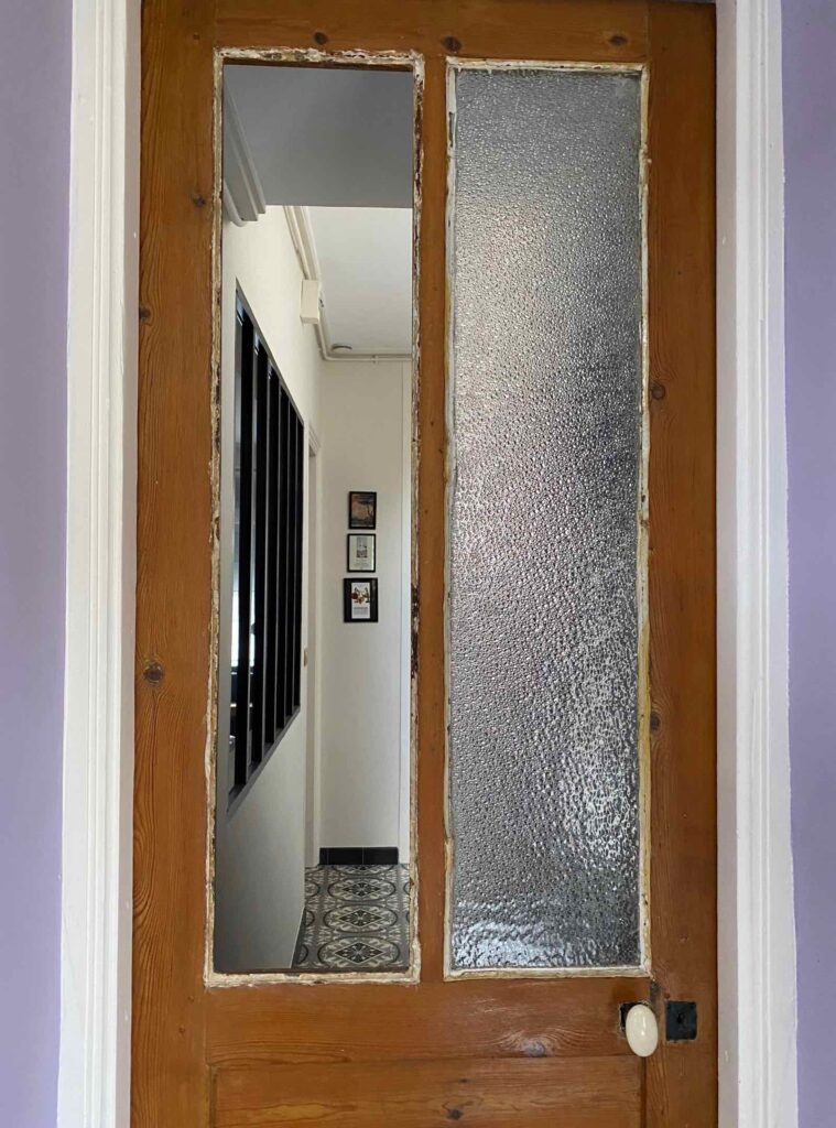 Ce travail préparatoire étant fait, il fallait choisir les verres. Souhaitant conserver le verre très ancien de l’un des deux panneaux de ma porte, j’ai demandé à mon aide de camp préféré de bien vouloir le démonter… sans trop le casser. C’est ce qu’il a fait, avec succès… laissant pour plusieurs semaines la porte dans cet état.