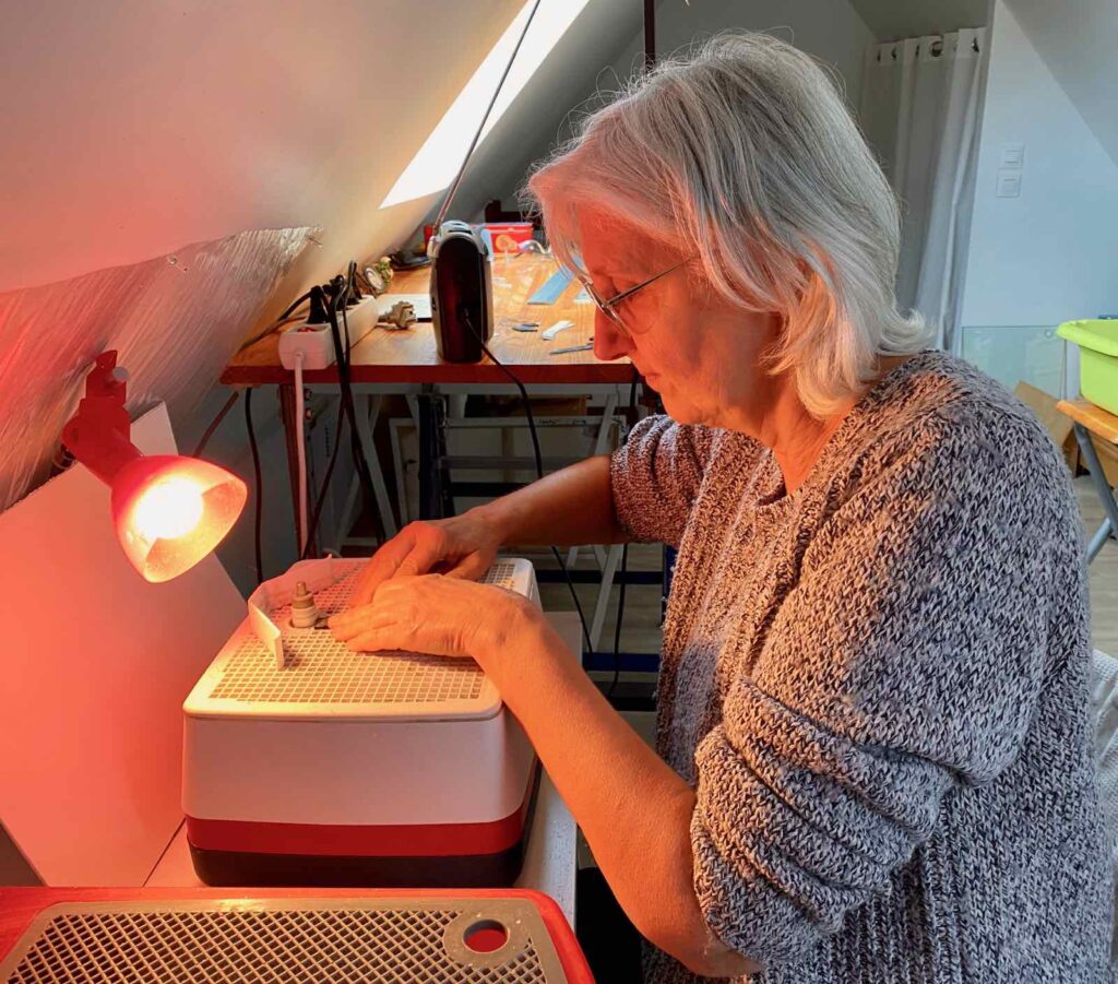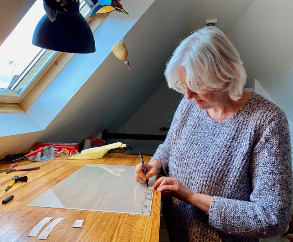 Avant de poursuivre, il faut que je vous précise que Françoise utilise la technique du vitrail Tiffany. C’est-à-dire qu’elle n’utilise pas de plomb mais insère les pièces de verre dans un ruban de cuivre autocollant, avant l’assemblage et la soudure à l’étain.