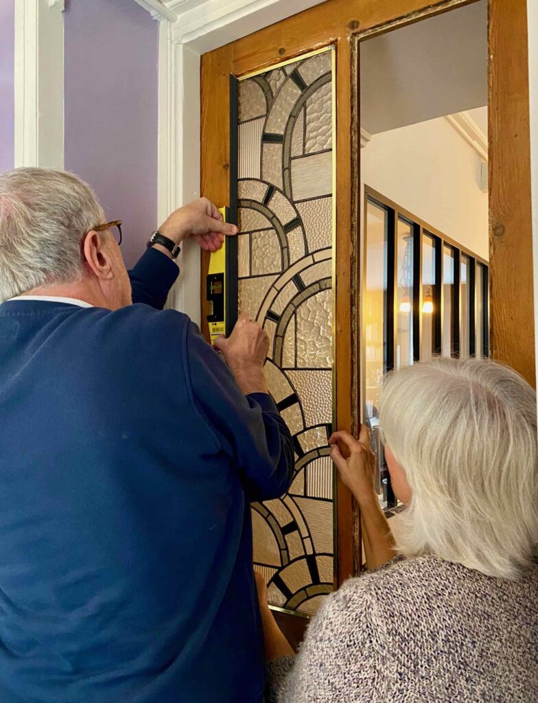Pour renforcer le tout et être sûre qu’il n’arrivera rien à mon vitrail Art déco, Françoise l’insère dans un cadre en laiton sur mesure. Il est alors prêt à être posé dans son logement, préparé et nettoyé par Francis, notre aide de camp.