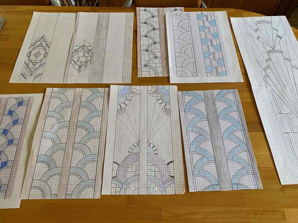 Françoise s’en est inspirée pour réaliser une série de dessins qu’elle m’a soumis. Plusieurs me plaisaient, dont celui tout à droite. Mais mon choix s’est porté sur celui en bas, à gauche. J’aimais bien les formes arrondies, rappelant celles des vitraux vus sur Pinterest. Mais aussi les cercles du sol de mon couloir (LIRE ICI). Et comme le nouveau vitrail Art déco allait séparer le couloir de la cuisine…