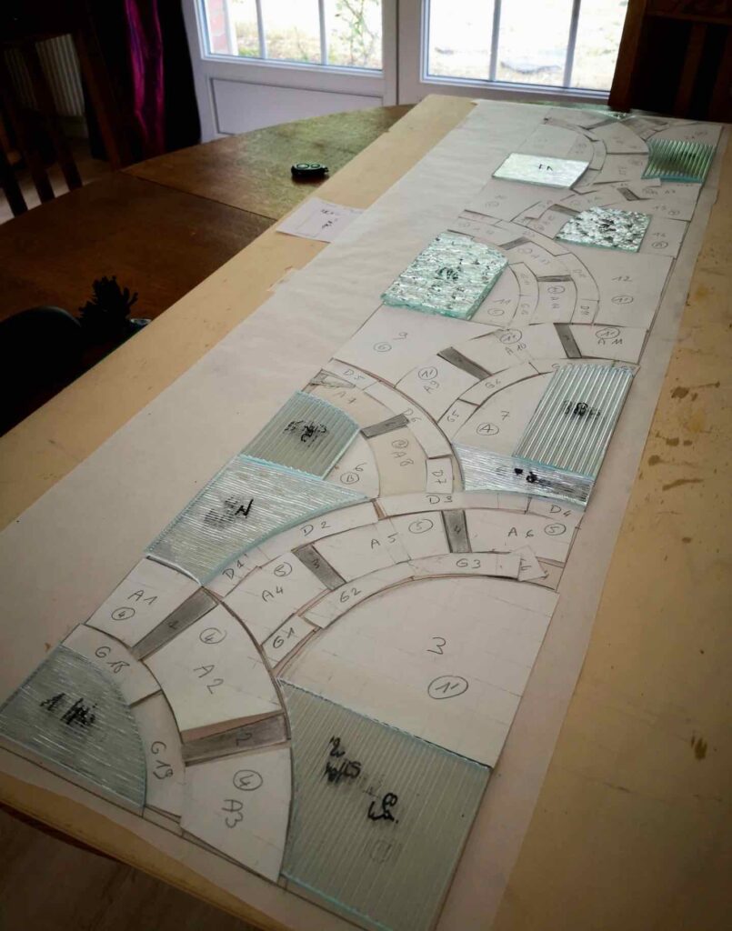 Au fur et à mesure qu’elle coupait les pièces de verre, Françoise m’envoyait des photos de mon futur vitrail Art déco « in progress ». Comme un grand puzzle, avec chaque jour moins de pièces manquantes…