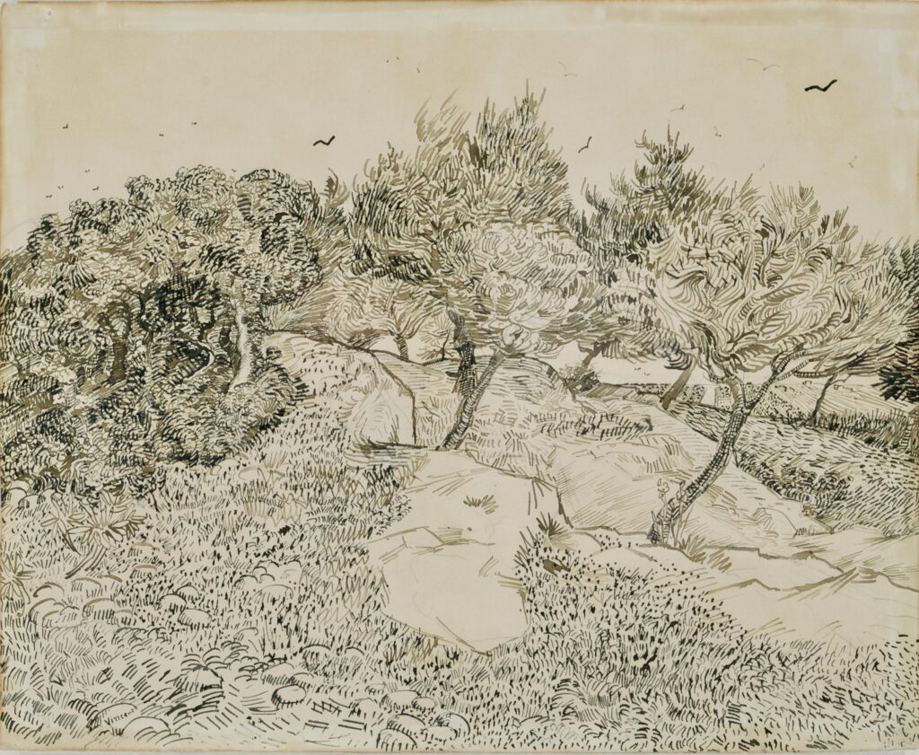 De Van Gogh, le musée possède un grand dessin, une encre sur papier, « Les Oliviers à Montmajour » (1888) .