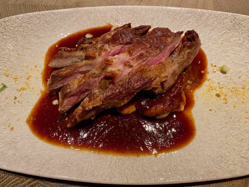 En plat, j’ai opté pour un Iberico Secreto, poivrons jaunes et sauce Cumberland (28 €), qui avait fait le spectacle devant nos yeux, sur le gril. Avant de savourer un moelleux chocolat, que j’ai aussi oublié de photographier… trop pressée de m’y attaquer.