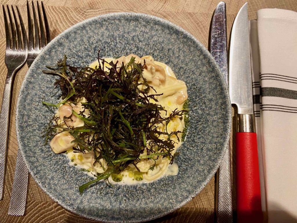 Dans ce temple du bon goût, j’ai commencé mon repas par de sublimes pâtes à la pancetta en entrée (20 €). Elles avaient transité par l’intérieur d’une meule de parmesan, après leur cuisson sur le feu.