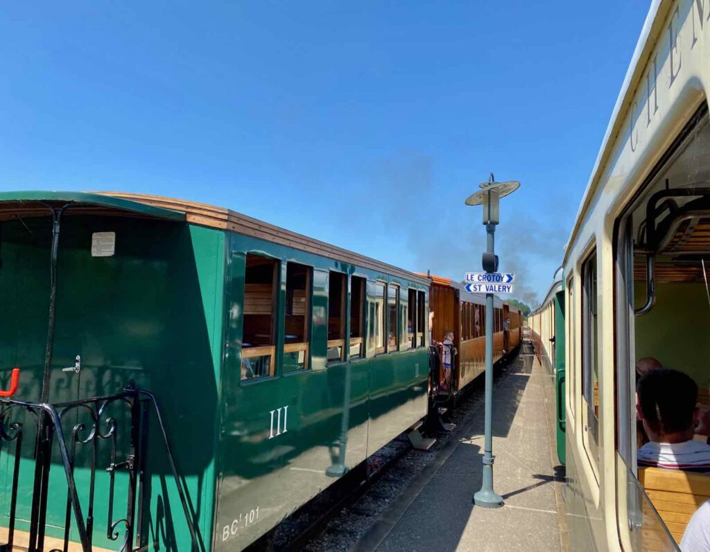 Crachotant son nuage de fumée, le train chemine au fond de la baie de Somme dans une belle lumière de fin d’après-midi. Puis, après une heure de route, c’est l’arrivée à Saint-Valery.