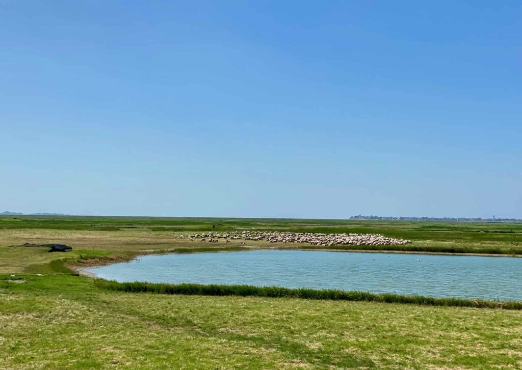 Puis ce sont les mollières, les prairies, les moutons de prés-salés et, tout au fond, la silhouette du Crotoy, qui se dessine dans l’horizon. Je les devine au loin, les deux tourelles de l’hôtel que j’adore (lire ICI).