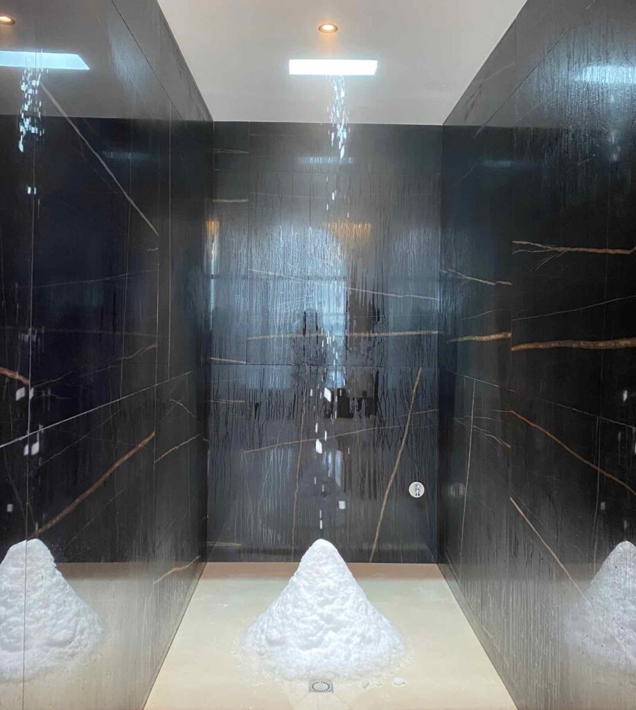 Avant ou après, prenez donc une douche sensorielle. Brume froide puis pluie chaude tropicale (sur fond de chants d’oiseaux), qui m’a replongé direct dans mes voyages en Asie du sud-est… Mais mon expérience préférée reste la grotte de sel de l’Himalaya, pour son côté très apaisant et les vertus thérapeutiques de ces mystérieuses pierres…