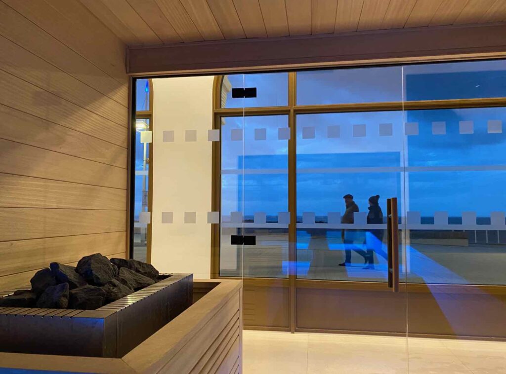 La piscine chauffée (à environ 30°) de 16 mètres de long donne sur la digue, ce qui rend la baignade deux fois plus sympa. Même vue pour le grand sauna, d’où on observe les promeneurs… qui vous observent.