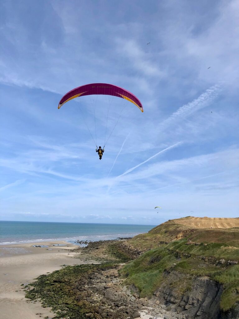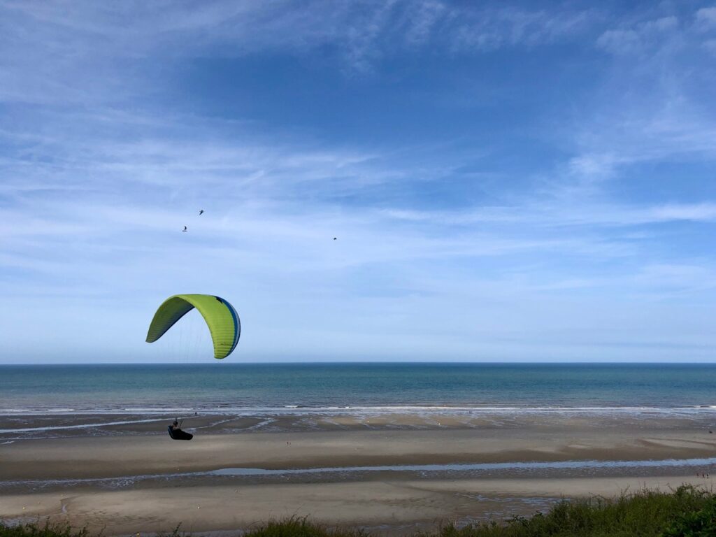 Discrète en diable, Équihen-Plage devient carrément sauvage au nord, aux abords de sa crique de la Crevasse. Là, un dimanche matin, nous avons longuement observé des parapentistes qui s’amusaient dans un ciel presque azur. C’était le 21 juillet dernier…