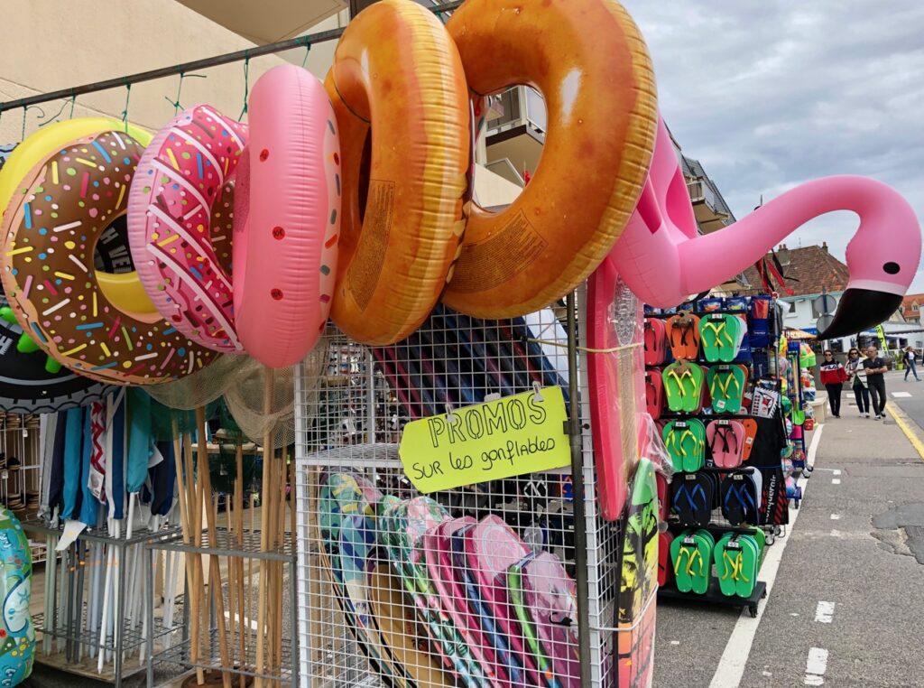 Côté ville… c’est encore la plage, avec tous ces seaux, pelles, épuisettes, tongs et rigolotes bouées flamands roses. « Promo sur les gonflables » ? Oui, c’était la fin de l’été…