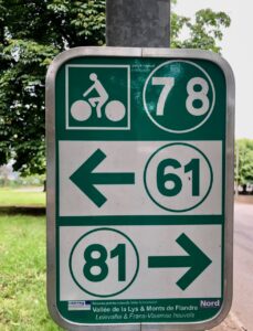 Regardez par exemple ce panneau. Le 78 est le point où on se trouve, au Mont des Cats. À gauche, on pédale vers le 61. À droite, on part vers le 81. Enfantin, non ?