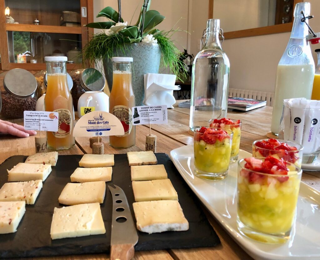 Pain croustillant, beurre de ferme, excellents fromages artisanaux (Mont des Cats, tome de Cassel à la bière…), confitures maison (j’adore celle à la framboise), salade de fruits frais (en ce moment avec des fraises de Berthen), yaourts fermiers, viennoiseries, jus de pomme produit par son voisin, miam, miam, miam….