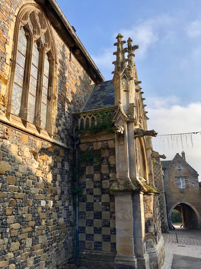 Quelques mètres plus loin, à droite, c’est l’entrée de l’église Saint-Martin, une église à deux nefs du XVe siècle. Je l’aime particulièrement pour le mélange de pierre calcaire, de silex et de grès. Mais aussi pour ses gargouilles qui tendent le cou vers la rue.