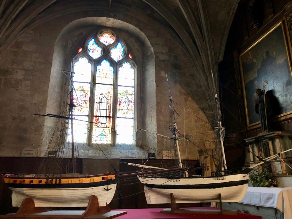 À l’intérieur, les voûtes sont des carènes de bateau renversées, réalisées par des charpentiers de marine. Tandis que des bateaux décorent l’église.